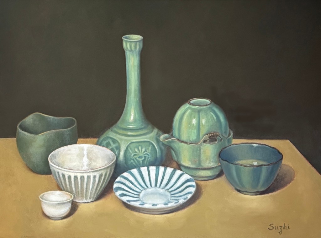 My shapes and overall compositions still hold up; I’m happy with those choices. But the values? In several passages I could have orchestrated them more deliberately to create stronger focus, depth, and mood. For instance, “Group Portrait 1”, for the small white cup and the dish in the center, the reflective surface and the blue strips makes the lighting not as informative as on others. I wrestled with those forms for hours. Now I realize I could have analyzed and designed the value patterns based on my knowledge (where the lightest light, darkest dark and mid-tones should be given the light source and the object’s shape), and considered their roles in the whole picture. With more intentional grouping and subordination, those objects could have popped or tucked in with far less effort.