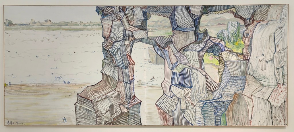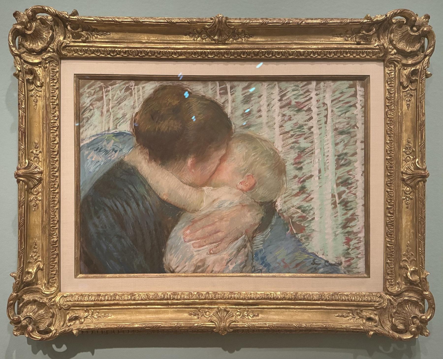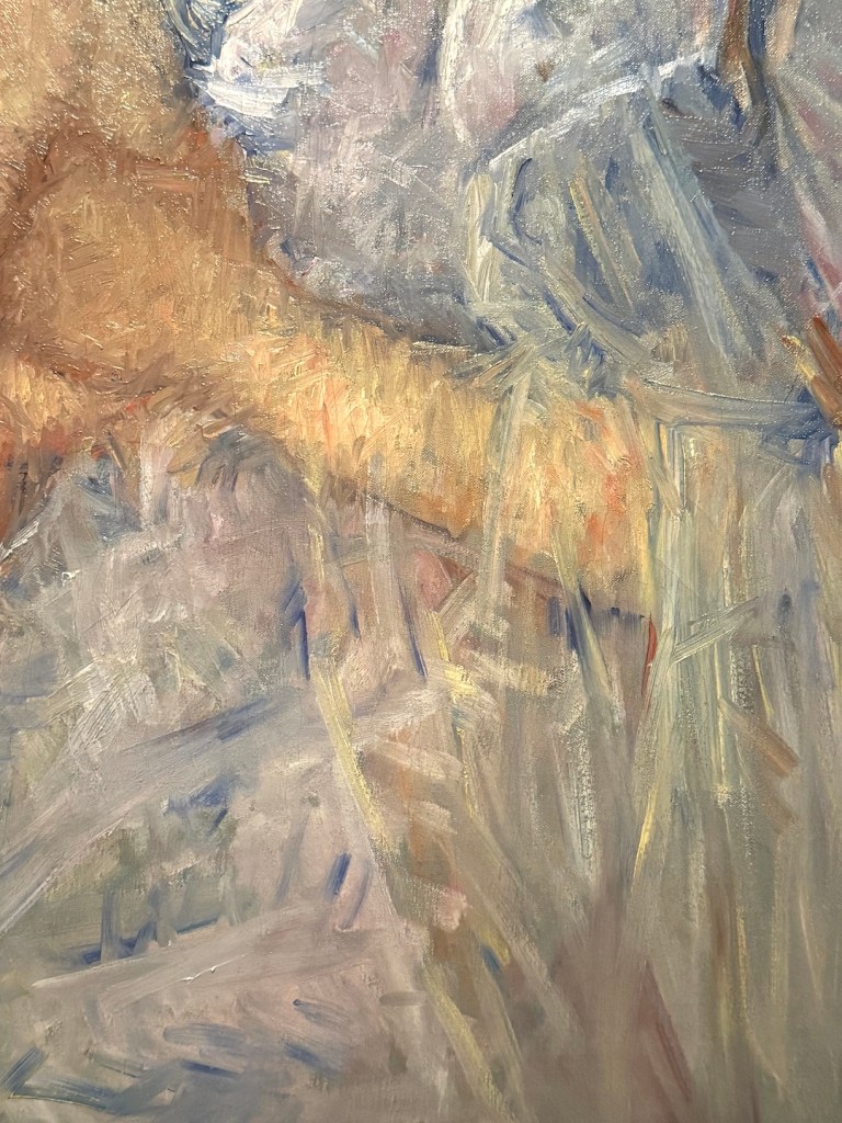 Two paintings from the show stood out for me. “A Goodnight Hug,” a pastel, is the best showcase of her skills. It is impressionist in style, with a penetrating sense of intimacy, but it is carefully designed to avoid cheap sentimentalism. The soft, curvy shapes of the mother and child contrast with the straight lines and scratchy, broken patterns in the background, making the piece visually intriguing. “In the Loge”, 1878, another a masterpiece in design, also offers an important perspective on female agency. It features the side view of an elegant woman at the opera. Dressed in black, she is intently scrutinizing the performance through opera glasses. The woman dominates the painting, but her attention is elsewhere. The light-colored balconies curve and extend to partition the background into big shapes. Tiny figures of audience serve almost as decorations, except for one man, who is looking at her through glasses. The painting depicts a woman in public, consciously aware of her surrounding, but decided to pursue her own interests, ignoring male gaze. Her face is delicate but determined. The poster-like composition has a modern simplicity that echoes the decisiveness of the subject.