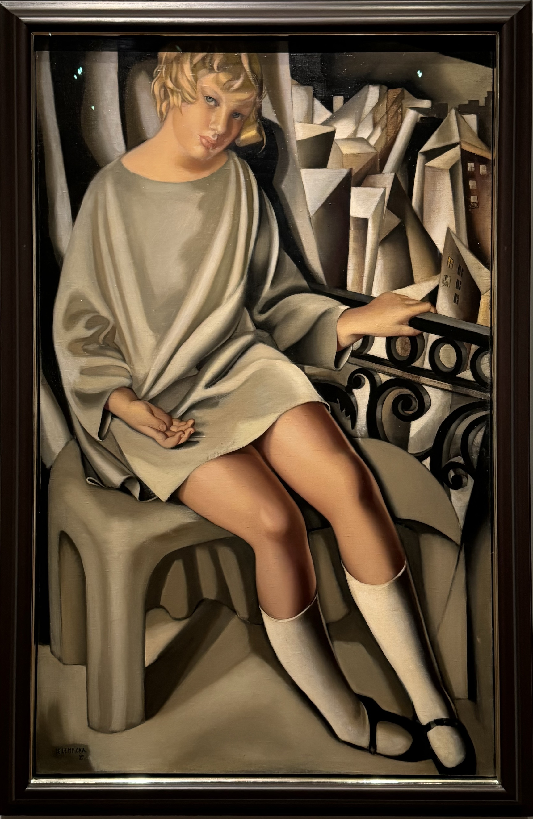 The paintings I like the most in the show are those where Lempicka used her daughter as the model, represented by “Kizette on the Balcony,” a piece that brought her first recognition. Unlike Cassatt, Lempicka married and had children, but she tried hard not to be seen as a mother. When “Kizette on the Balcony” was shown in Paris, it was simply titled “On the Balcony.” However, there is a sense of intimacy and sensitivity that makes this piece endearing. The young girl sitting on the balcony fills the plane, forms a diagonal relationship to the confines of the frame. This dynamism add liveliness to the painting. The smooth curvilinear shapes of the body set against the crowded sharp-edged geometric buildings in the background, symbolizing the contrast between childhood and the mature world. The girl’s presence is almost towering, and her expression inquisitive. There is wondering, but no hesitation.