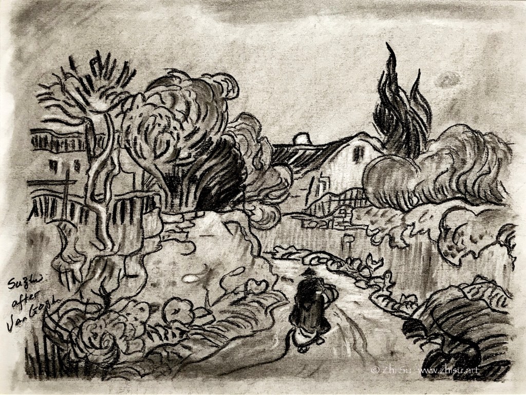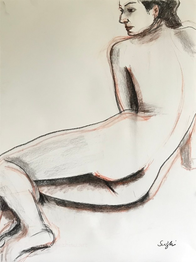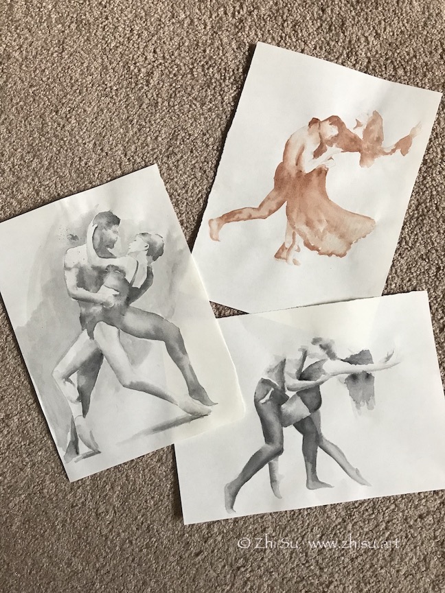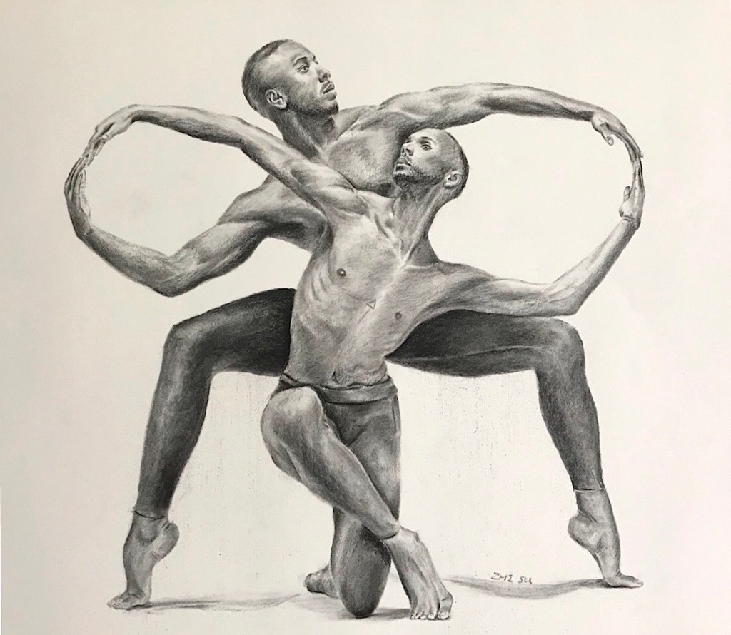 The last one is a strange pose. It has an enclosed and squarish quality and a lot of symmetry. The lighting is mainly top-down, making it more grounded and static. It’s not a composition that I would normally choose to work on. On the other hand, there’s a nice contrast between the infinity loop formed by the arm, and zig-zag pattern formed by heads, torso and the legs in the middle. There’s tension and connection between the two dancers at the same time and that’s what I was aiming for when starting the piece. However, as I worked on, and as always, I was distracted by the details, and lost my focus. I think the zigzagging is there, but the details of the hands cut in the flow of the loop. I also think the value contrast is not enough and shapeless. I think this is mainly because I am still copying what I see instead of using it as a reference to create. I hope when I have a better grasp of human figure, I could look beyond the photo and draw my interpretation.