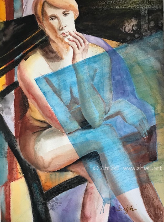I also tried to wet the paper first, with some color, and then applied the Caran d’Ache before the paper dried. Some color bleeds more than others. In the red color figure, I went back and force a bit with the pastel and a wet brush to achieve a desirable result. In the greenish one, the paper dried quickly, and I was only able to do a drawing.