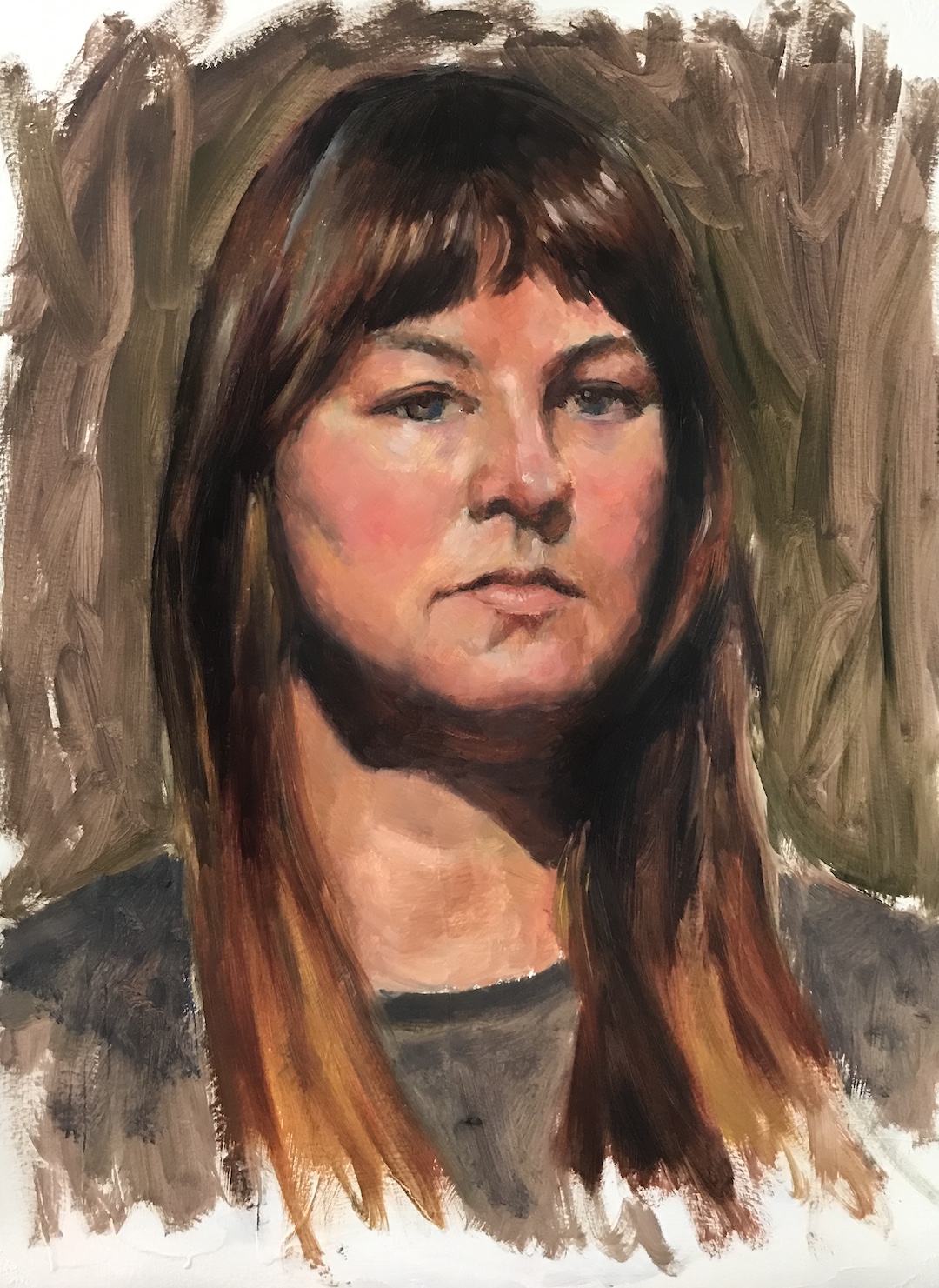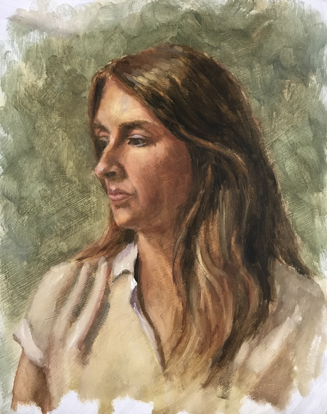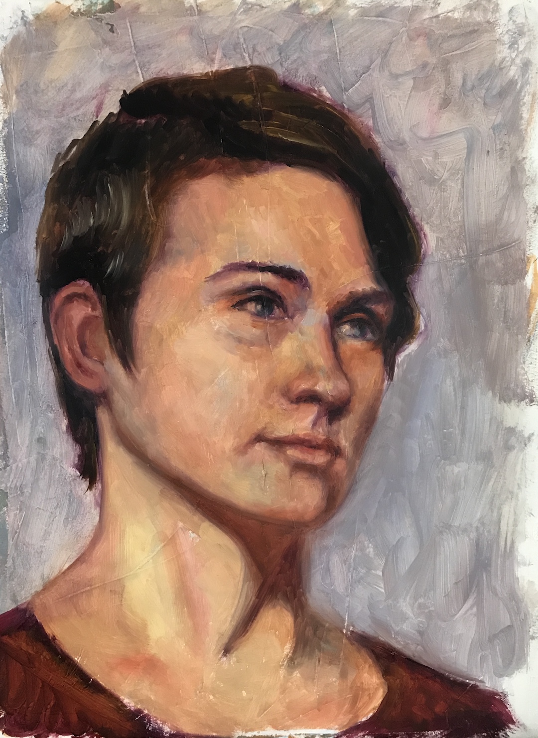Then I tried something in between. I didn’t use a photo, but I did use a face I know very well. Instead of inventing features from scratch, I largely followed what I thought was me (with plenty of upgrades, of course). The result was also somewhere in between. It’s not as loose as the invented portraits, but more relaxed than those painted from a photo. And to be honest, I really like my new look.