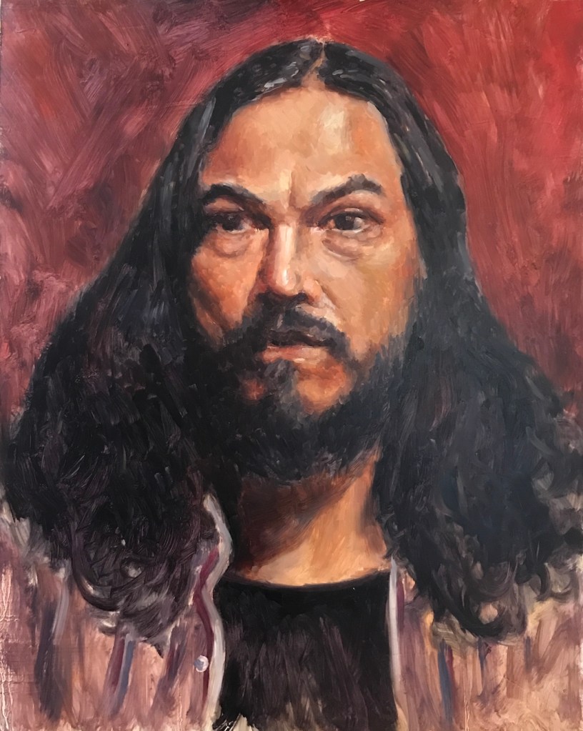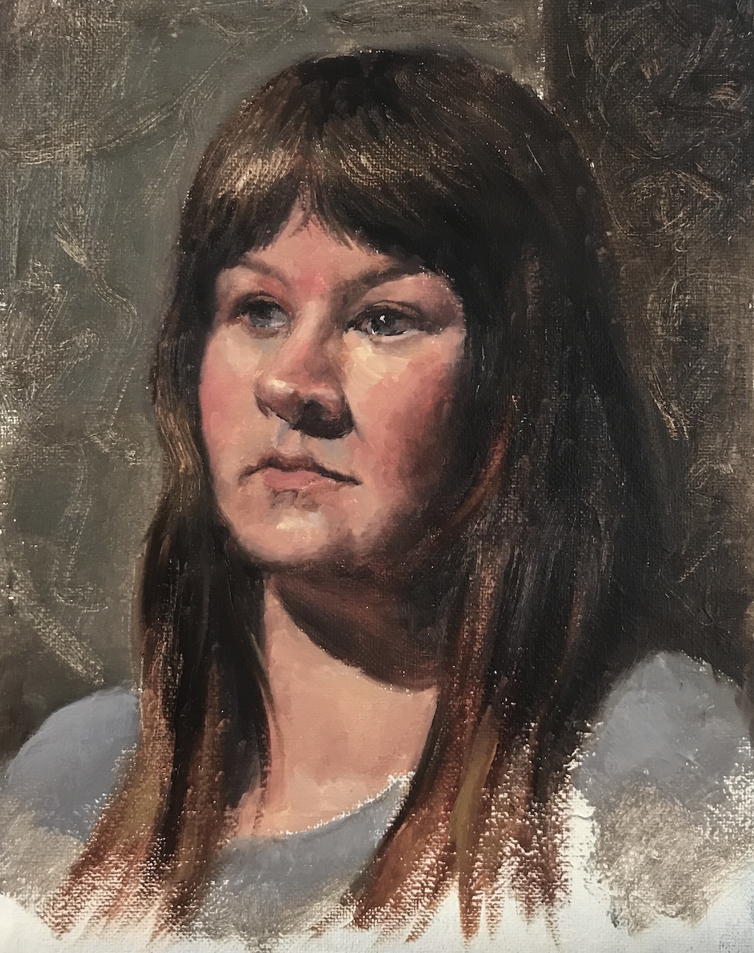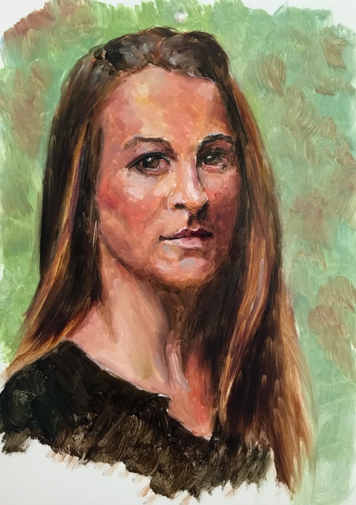 Then I tried something in between. I didn’t use a photo, but I did use a face I know very well. Instead of inventing features from scratch, I largely followed what I thought was me (with plenty of upgrades, of course). The result was also somewhere in between. It’s not as loose as the invented portraits, but more relaxed than those painted from a photo. And to be honest, I really like my new look.