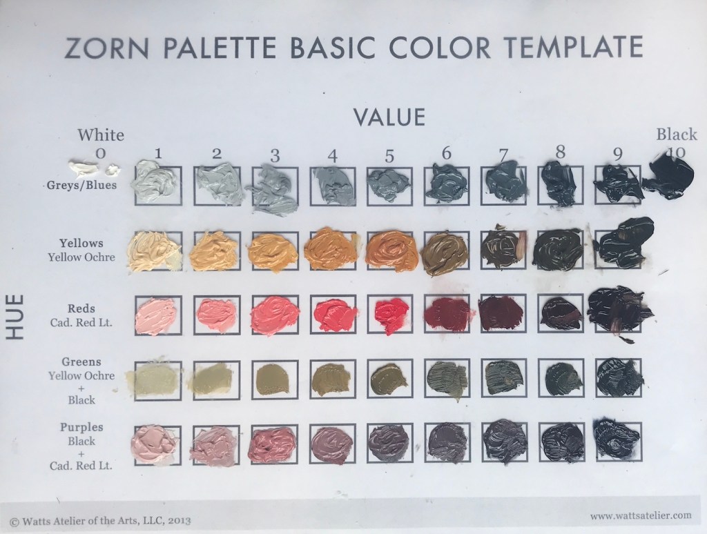 Color chart and value scales are among the things that appear in almost every art book, and are practiced in some form, in every art class. They are also the things I have been avoiding. So tedious! A Zorn palette chart, 45 little squares in total, is a required assignment from my Watt’s Atelier class. Just the push I need.